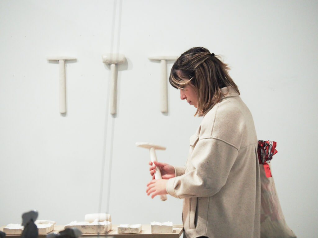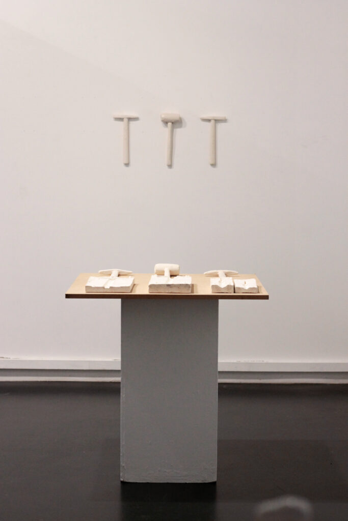 L'outil est un objet fabriqué doté d'une forme et de propriétés physiques adaptées à un usage et une production déterminée. L'usage de la technique de coulage de barbotine dans un moule en plâtre renvoie à l'aspect reproductible de ce type d'outil, néanmoins cela reste une technique de moulage pointue, difficile à maîtriser et dont le rendu peut parfois présenter des aspérités. En outre, chaque outil reproduit est unique en fonction de chaque coulée.